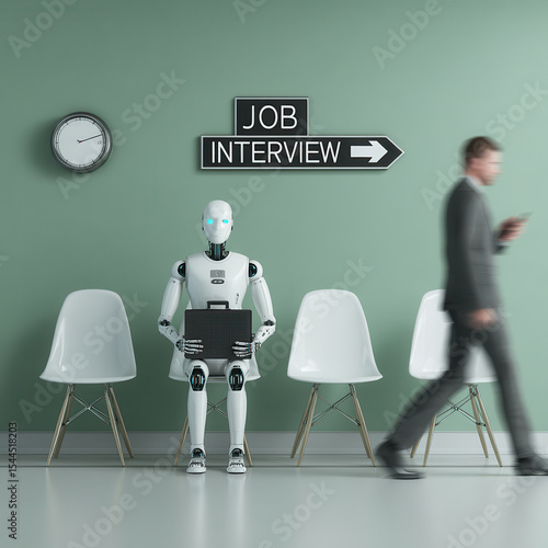 Futuristic humanoid robot awaits job interview in minimalist waiting room with professional ambiance