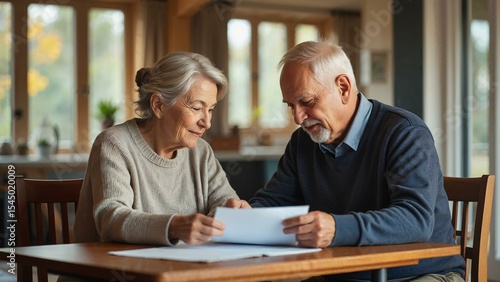 Elderly couple reviewing documents together in a bright, cozy home setting