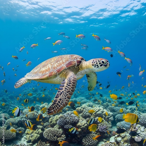 Green sea turtle gracefully glides through a vibrant coral reef, a majestic reptile in its underwater ocean home