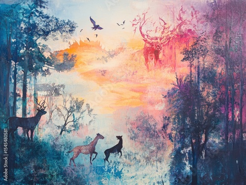 Vibrant forest at sunset with wildlife