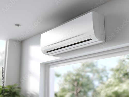 白い室内壁に設置された最新型エアコンと明るい窓辺