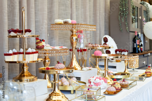 słodki stół domowej roboty w różowej kolorystyce. ciastka na ozdobnych paterach równo poukładane