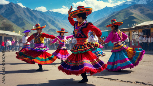 Traditional peruvian dancers in colorful costumes perform against majestic mountain backdrop during festival celebration