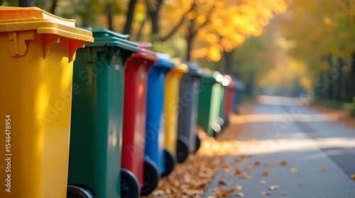 Colorful Recycling Bins Lined Up on Autumn Street, Leaf Litter, Sustainable Waste Management, Environmental Awareness, Fall Foliage