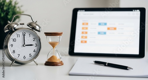Time management concept with alarm clock, hourglass, tablet and stationery