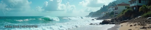 Devastating tsunami wave crashes over coastal buildings, leaving behind a trail of destruction and debris Powerful surge, natural disaster, environmental catastrophe , water, seismic activity, ocean