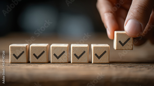Wooden blocks with checkmarks are arranged in a row, with a hand placing the last block, symbolizing completion and approval.