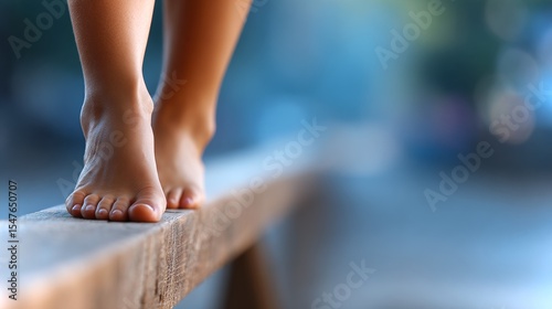 Close-up of an Asian girl's foot balancing on a narrow ledge in a serene outdoor setting