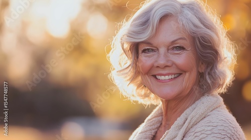 kobieta, portret, starsza kobieta, uśmiech, radość, naturalne światło, złota godzina, miękkie światło, jasne tło, rozmyte tło, zamazany background, pastelowe kolory, neutralne barwy, delikatny makijaż