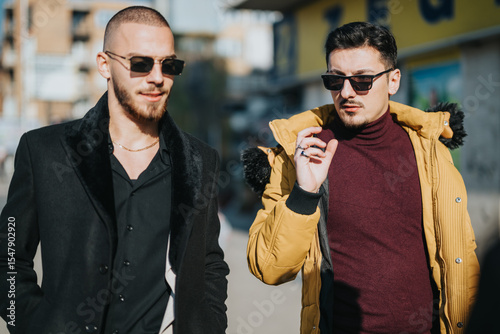 Two fashionable young men wearing sunglasses and trendy outfits confidently stroll outdoors, exuding style and charisma in an urban setting under bright sunlight.