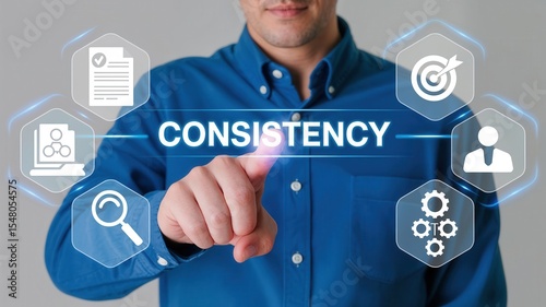Businessman interacting with floating icons representing consistency and performance. Professional consistency, strategic work flow, business reliability.