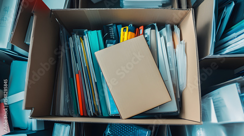 una caja con documentos y papeles y cosas personales de oficina por el despido o desempleo en la empresa en la oficina guardando cosas