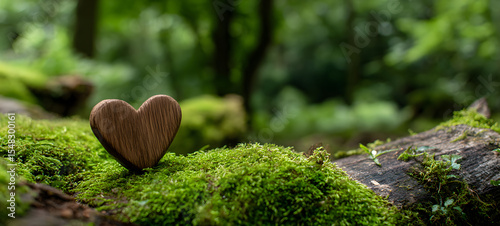 Forest cemetery funeral backdrop with close up of wooden heart on moss. Natural burial site in woodland for tree burial