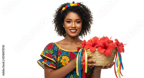 Baiana em Vestimenta Típica com Cesto de Hibisco nas Mãos – Imagem Isolada Fundo Branco
