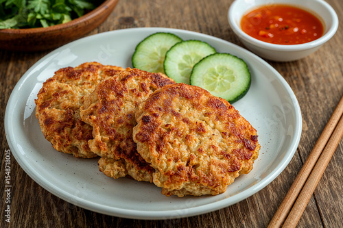 Crispy golden patties with fresh cucumbers and spicy sauce