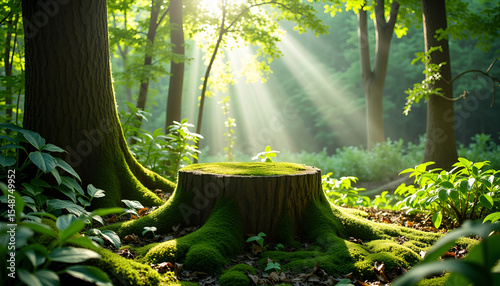 Early rays of sunshine break through the trees in a moss-covered forest