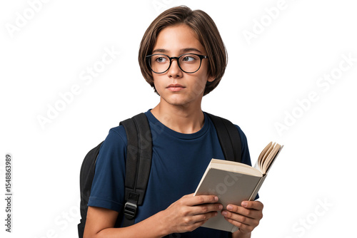 Handsome young school boy with glasses holding an open book while looking away, isolated on transparent background