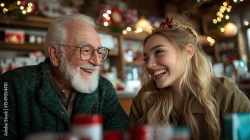 An affectionate moment shared between a cheerful grandfather and his granddaughter captures the warmth of family and the joy of intergenerational connection during the holiday season.