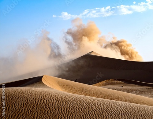 Burzą piaskowa na pustyni. Tumany kurzu i piasku unoszone przez wiatr nad wydmami