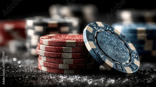 Close-up of poker chips, red and blue, stacked