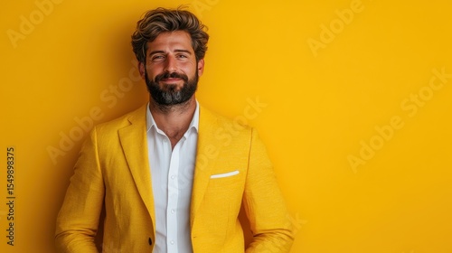 A confident man wearing a bright yellow suit stands against a vivid background, exuding charisma and a strong sense of personal style and self-assuredness.