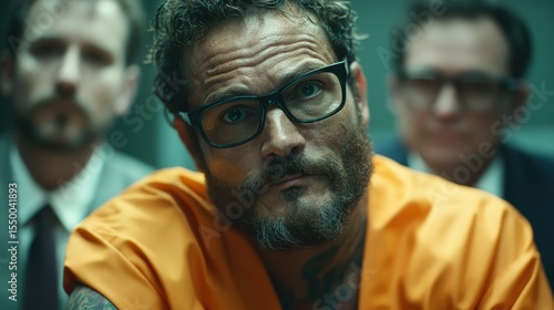 A close-up portrait of a rugged man in an orange jumpsuit staring intently with deep emotion in an interrogation room, portraying themes of tension, struggle, and intrigue in human nature.
