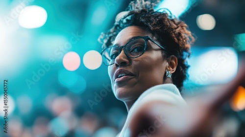 A confident woman exudes charisma while looking over her shoulder, surrounded by an engaging urban environment and vibrant bokeh lights, capturing a moment of empowerment.