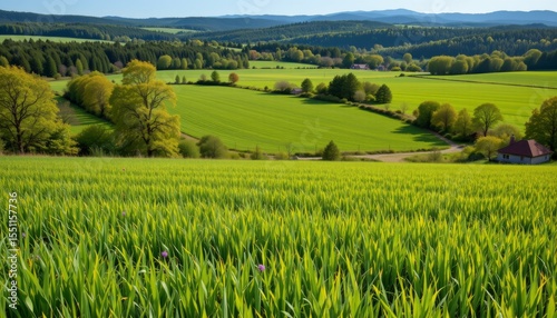 the image captures a bright, grassy field in the foreground, with individual blades of grass clearly defined