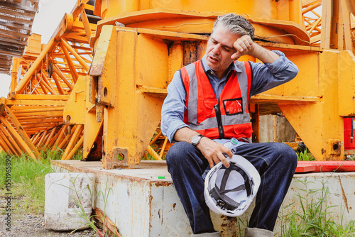Senior foreman overseeing large construction site sits down rest exhausted from hot weather thirsty dizzy headache fainting dehydrated wants drink water and suffers heatstroke due hot humid summer.