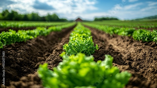 vegetable crops in neatly arranged rows, including lettuce, cabbage, and kale, taken from a low-angle view with a clear vanishing point and distant field barn