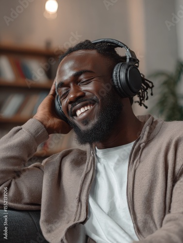 Young African American man host in headphones enjoying podcasting in his home studio. Handsome podcaster laughing while streaming live audio podcast