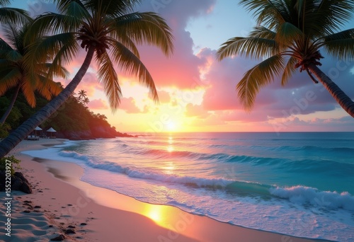 clear blue ocean palm tree silhouettes tropical paradise serenity coastal landscape, sea, water, tropics, beach, sky, wave, island, relaxation, sunset