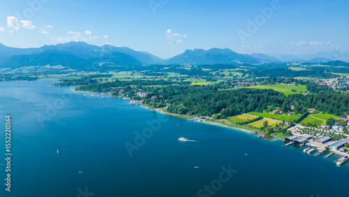 Aerial view of Prien am Chiemsee, a charming Bavarian town on the shore of Lake Chiemsee. Captured in summer, perfect vacation vibes with clear water, green landscapes, and sunny weather
