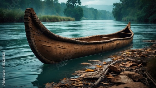 A traditional dugout canoe made from a hollowed-out tree on a riverbank.
