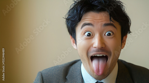 馬鹿にするように舌を出すスーツを着たアジア人のビジネスマン