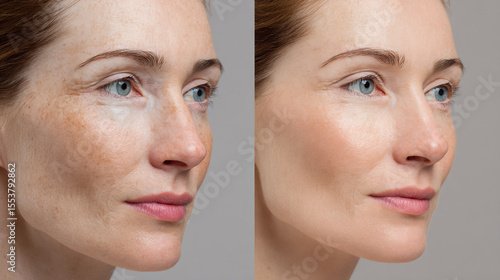 Woman with blemish skin and radiant skin after retouch: Before and after beauty retouch showcase the woman radiant skin after skincare for perfect skin.