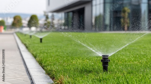 Automatic sprinklers watering green lawn near office building, irrigation system for watering plants and grass.