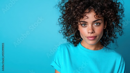 A confident young woman poses stylishly against a bright blue backdrop, showcasing her curly hair and trendy outfit while exuding charisma and individuality.