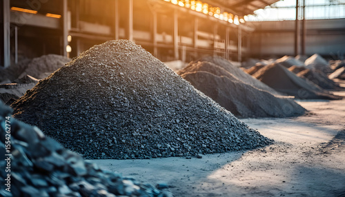 Piles of rare earth elements and metallic ores in industrial warehouse, raw materials for tech, electronics, renewable energy