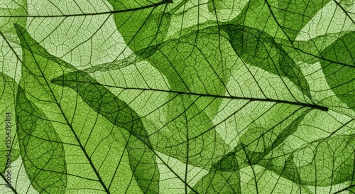 Overlapping green leaves with visible vein texture and glowing light from behind, giving a botanical x-ray effect, organic pattern for wallpaper, natural science.