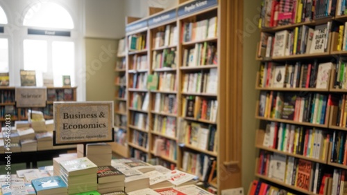 Blurred books and shelves create a vibrant library atmosphere indoors, with business and economics sections highlighted by soft focus and defocused background.