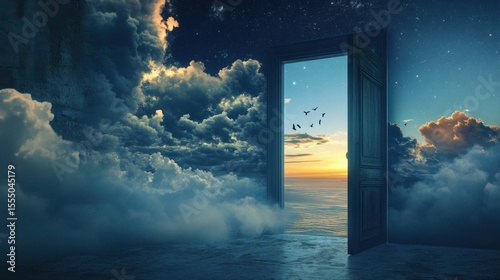 Gateway to the Surreal: A portal unfolds, revealing a breathtaking landscape of swirling clouds, celestial skies, and an open doorway.