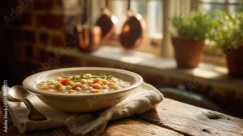 木製テーブルの白いんげん豆煮込み