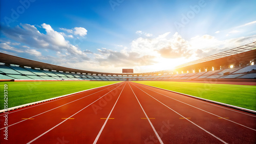Running track curves through a stadium with a bright, cloud-filled sky enhancing the perspective and sense of athletic competition.