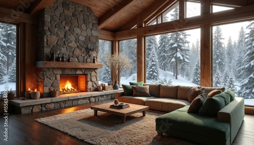 Cozy cabin interior with warm fireplace. Comfortable seating, large windows showcase snowy forest landscape. Luxury design, home decor, living room, tranquil place for rest. Fire burning inside, warm
