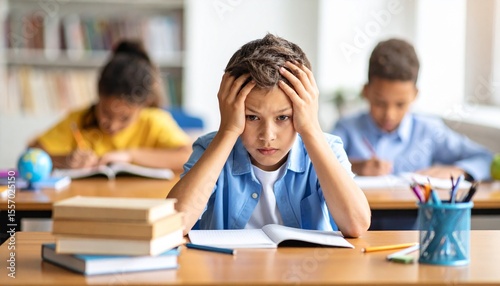 Frustrated boy holding head over homework at school desk