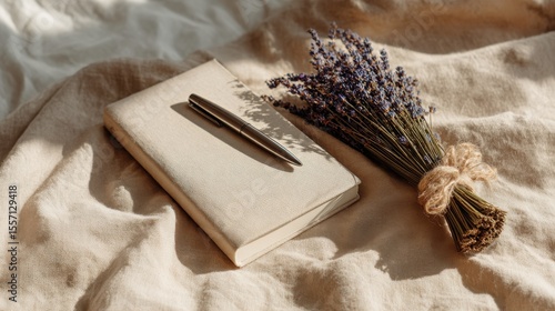 Minimal journal notebook with pen and lavender bundle on soft beige fabric in natural light perfect for journaling visuals, self-care themes and mindful lifestyle content
