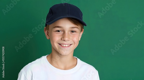 A young teenage boy wearing a cap smiles brightly at the camera, his happy expression and direct gaze captured against a fresh green background in this isolated portrait.