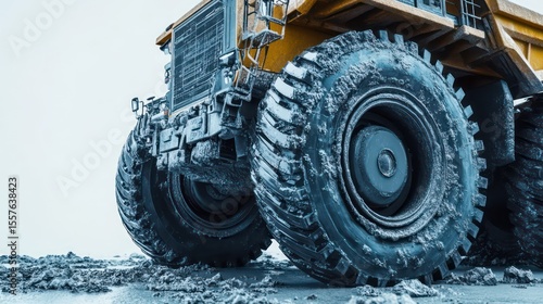 Isolated mining dump truck with massive wheels and rugged steel construction on pure white background, heavy machinery detail.