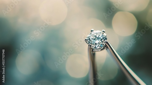 Close up of a diamond ring held by elegant tweezers with a soft background blur The diamonds facets catch the light creating brilliant flashes that highlight its intricate cuts